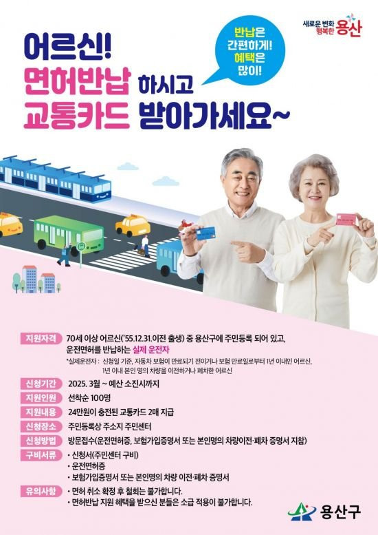 [2] 연합뉴스 - 동작구, 70세 이상 운전면허 반납시 총 40만원 교통카드 (https://www.yna.co.kr/view/AKR20250519052500004)