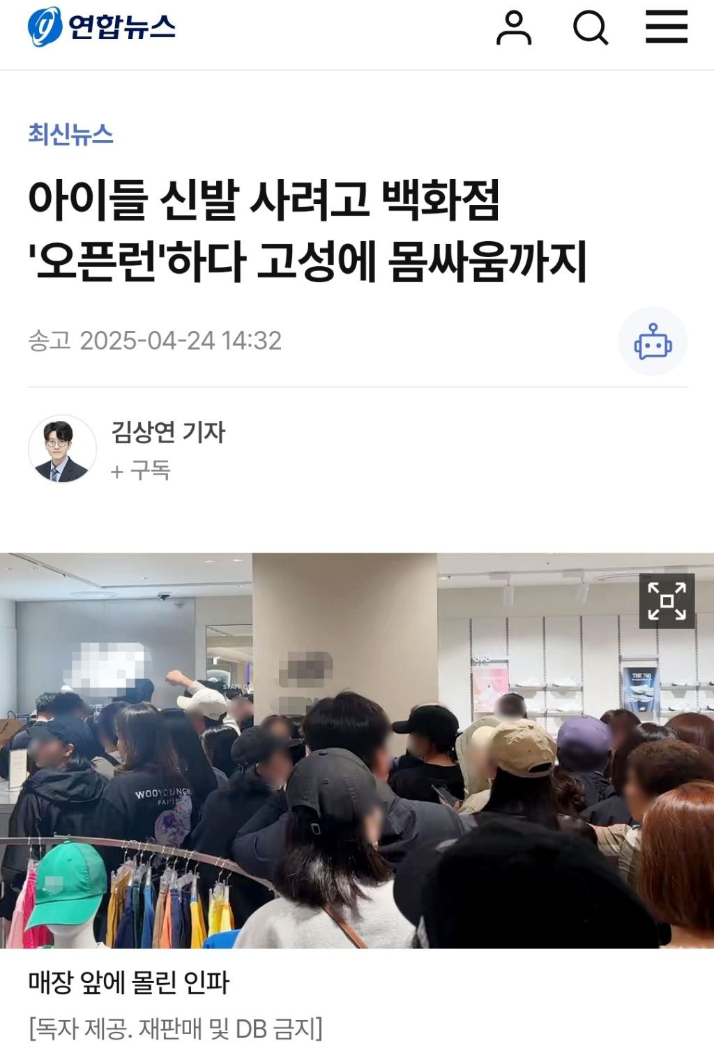 [4] 파이낸셜뉴스 - 아이들 신발 사려고 백화점 오픈런하고 고성에 몸싸움까지 ' ... (https://www.fnnews.com/news/202504242019362982)