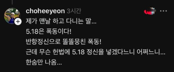 조희연은 자신의 소셜 미디어에서 "5·18은 폭동인데 헌법에 넣겠다"는 발언을 하였습니다. 이 발언은 많은 이들에게 충격을 주었고, 그녀는 곧바로 비난의 대상이 되었습니다. 특히, 그녀의 발언은 5·18 민주화운동을 비하하는 것으로 해석되어 많은 네티즌들이 반발하였습니다.