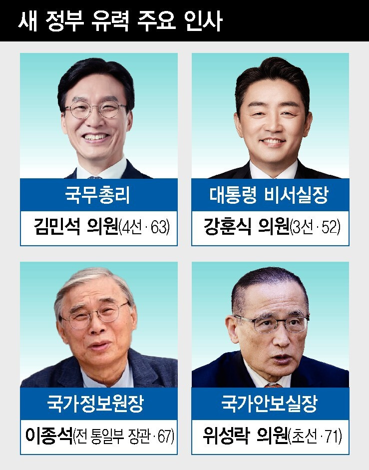 이번 정부의 주요 인물들은 다음과 같습니다. 김민석 국무총리(63세), 강훈식 비서실장(52세), 이종석 국가정보원장(67세), 그리고 위성락 국가안보보좌관(71세)입니다. 이들은 각자의 분야에서 오랜 경험을 쌓아온 인물들로, 새로운 정부의 정책을 효과적으로 추진할 수 있는 능력을 갖추고 있습니다.