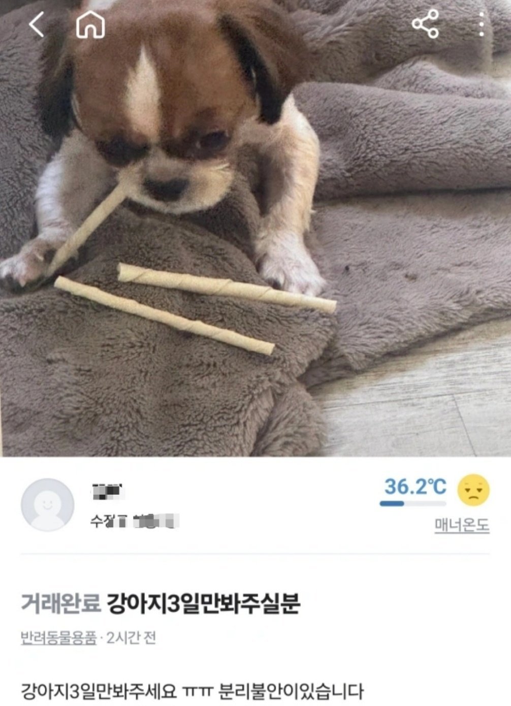 이 사용자는 반려견의 상태를 체크하기 위해 체온을 측정한 결과 36.2°C로 정상 범위에 있었지만, 여전히 걱정이 많았던 것 같습니다. 반려견을 맡길 때는 이러한 건강 상태를 체크하는 것이 중요합니다.