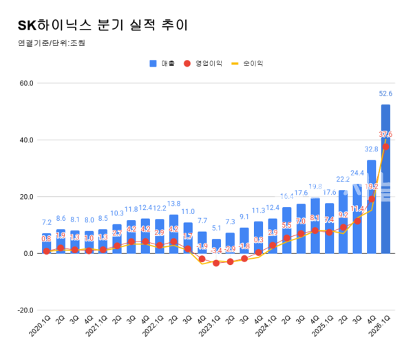 2026년 1분기 SK하이닉스의 영업이익은 37.6조 원으로, 이는 전년 동기 대비 401.6% 증가한 수치입니다. 매출액 또한 52조 6000억 원에 달하며, 이는 전년 대비 203.4% 증가한 것입니다. 이러한 성장은 반도체 수요 증가와 가격 상승에 기인한 것으로 분석됩니다. 특히, 데이터 센터와 모바일 기기에서의 메모리 수요가 급증하면서 SK하이닉스의 실적에 긍정적인 영향을 미쳤습니다.